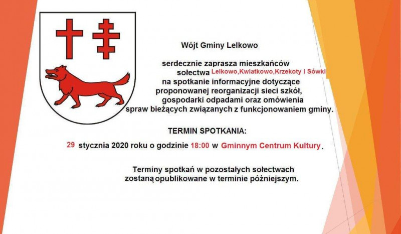 Wersja obowiązująca z dnia 28-01-2020 09:56:02 Drukuj Spotkanie Wójta Gminy Lelkowo z mieszkańcami sołectwa: LELKOWO, KWIATKOWO, KRZEKOTY, SÓWKI