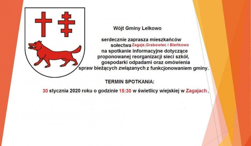 Wersja obowiązująca z dnia 28-01-2020 10:23:28 Drukuj Spotkanie Wójta Gminy Lelkowo z mieszkańcami sołectwa: ZAGAJE, GRABOWIEC, BIEŃKOWO