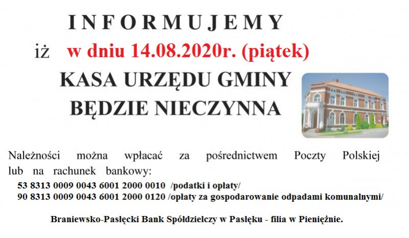 Wersja obowiązująca z dnia 06-08-2020 08:43:12 Drukuj UWAGA! Kasa Urzędu Gminy w dniu 14 sierpnia 2020r. będzie NIECZYNNA