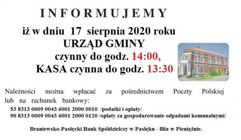 Wersja obowiązująca z dnia 17-08-2020 12:04:18 Drukuj INFORMACJA! W dniu 17 sierpnia 2020r. Urząd Gminy w Lelkowie czynny do godziny 14:00