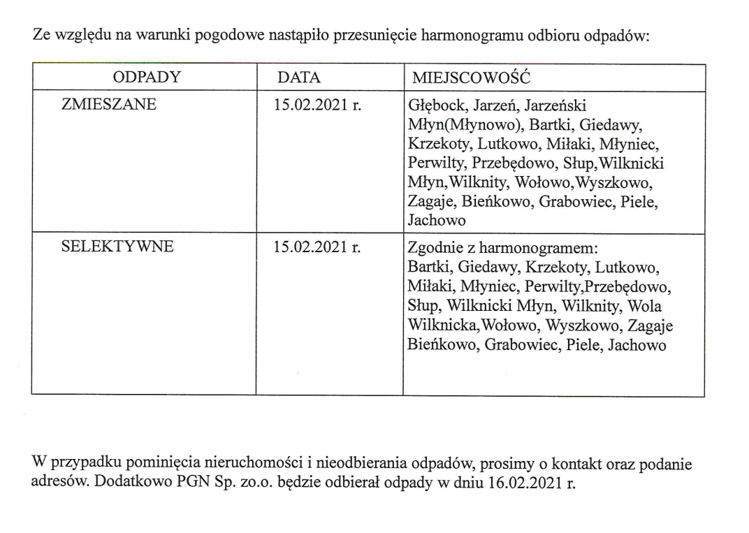 Wersja nieobowiązująca z dnia 15-02-2021 11:23:35 Drukuj HARMONOGRAM odbioru odpadów komunalnych z terenu gminy Lelkowo w 2021 roku Treść ogłoszenia stanowi poniższy załącznik Załączniki segregowane format: image/jpeg, rozmiar: 517.07 KB, data dodania: 21-12-2020 14:39:34 zmieszane format: image/jpeg, rozmiar: 509.07 KB, data dodania: 21-12-2020 14:39:34 Zmiana harmonogramu odbioru odpadów format: image/png, rozmiar: 288.31 KB, data dodania: 15-02-2021 11:23:35 Wersja nieobowiązująca Strona może zawierać nieaktualną treść i załączniki. Możesz pozostać na tej stronie lub przejść na wersję z obowiązującą zawartością. Nie pokazuj ponownie Pozostań Przejdź do wersji obowiązującej
