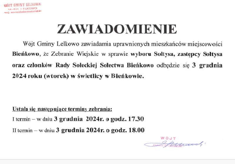 Wersja obowiązująca z dnia 25-11-2024 11:26:07 Drukuj ZAWIADOMIENIE O ZEBRANIU WIEJSKIM W CELU WYBORU SOŁTYSA I RADY SOŁECKIEJ W SOŁECTWIE BIEŃKOWO