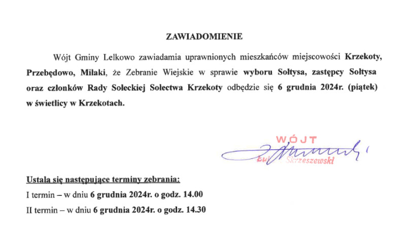 Wersja obowiązująca z dnia 27-11-2024 13:02:06 Drukuj ZAWIADOMIENIE O ZEBRANIU WIEJSKIM W CELU WYBORU SOŁTYSA I RADY SOŁECKIEJ W SOŁECTWIE KRZEKOTY