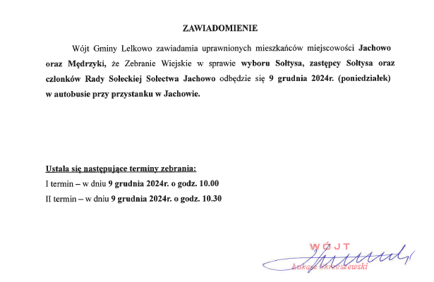Wersja obowiązująca z dnia 29-11-2024 14:23:07 Drukuj ZAWIADOMIENIE O ZEBRANIU WIEJSKIM W CELU WYBORU SOŁTYSA I RADY SOŁECKIEJ W SOŁECTWIE JACHOWO.
