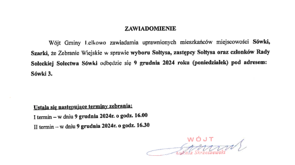 Wersja obowiązująca z dnia 29-11-2024 14:57:17 Drukuj ZAWIADOMIENIE O ZEBRANIU WIEJSKIM W CELU WYBORU SOŁTYSA I RADY SOŁECKIEJ W SOŁECTWIE SÓWKI