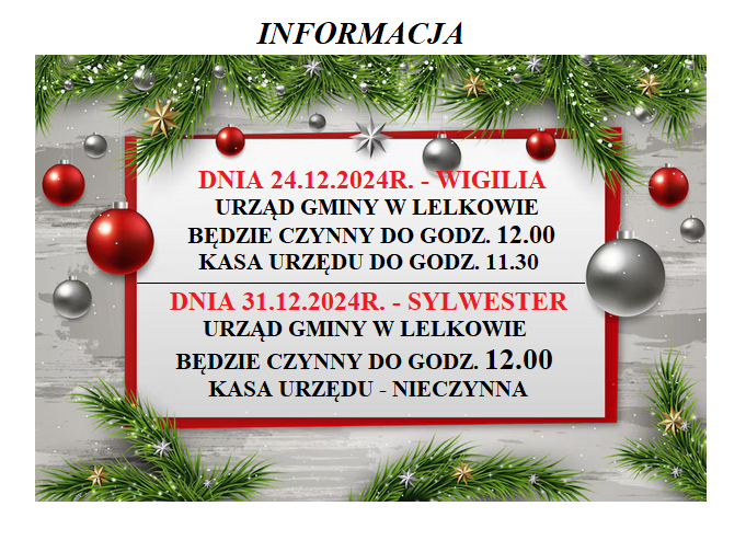 Wersja obowiązująca z dnia 10-12-2024 09:34:26 Drukuj Informacja o godzinach pracy Urzędu Gminy Lelkowo w dniach 24 i 31 grudnia 2024r.