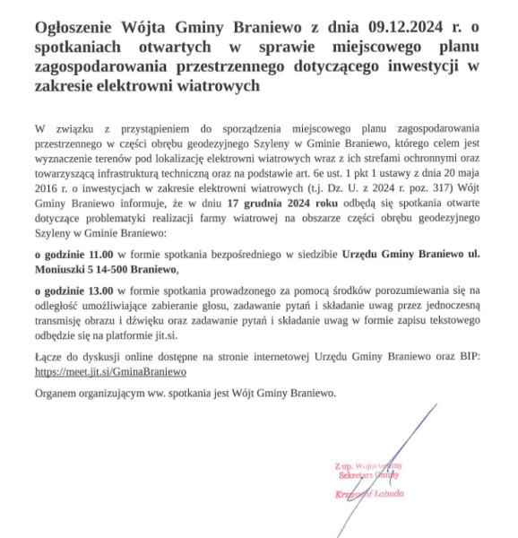 Ogłoszenie Wójta Gminy Braniewo z dnia 9.12.2024r. o spotkaniach otwartychw sprawie miejscowego planu zagospodarowania przestrzennego dotyczącego inwestycji w zakresie elektrowni wiatrowych.