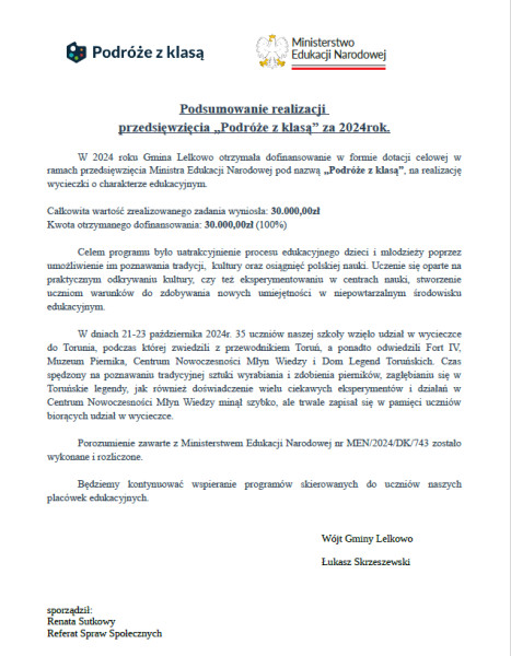 Wersja obowiązująca z dnia 20-03-2025 14:16:21 Drukuj Podsumowanie realizacji przedsięwzięcia "Podróże z klasą"