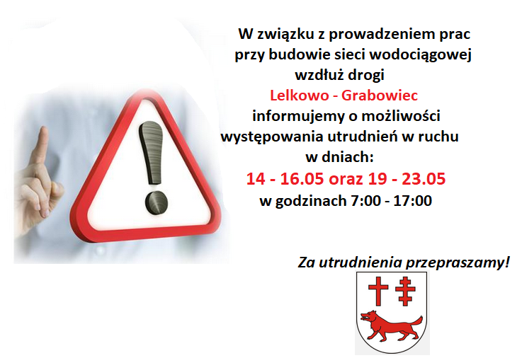 Wersja obowiązująca z dnia 13-05-2025 15:58:03 Drukuj Informacja o możliwości występowania utrudnień w ruchu na trasie Lelkowo - Grabowiec