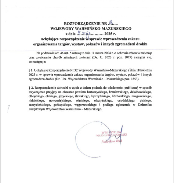 Rozporządzenie Wojewody Warmińsko - Mazurskiego z dnia 5 maja 2025r. uchylające rozporządzenie w sprawie wprowadzenia zakazu organizowania targów, wystaw, pokazów i innych zgromadzeń drobiu