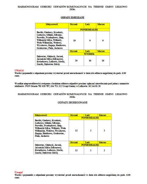 Wersja obowiązująca z dnia 29-12-2025 11:27:26 Drukuj Harmonogram odbioru odpadów komunalnych na terenie Gminy Lelkowo od stycznia do marca 2026r.