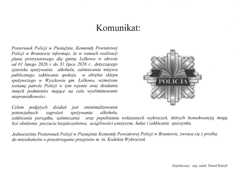 Wersja obowiązująca z dnia 18-02-2026 14:20:15 Drukuj Informacja Posterunku Policji w Pieniężnie dotycząca zdiagnozowanego zagrożenia na terenie gminy Lelkowo