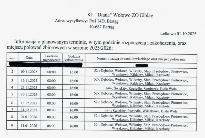 Wersja obowiązująca z dnia 02-10-2025 14:33:43 Drukuj Plan polowań zbiorowych w sezonie 2025/2026 w obwodzie łowieckim nr 52 oraz 144.